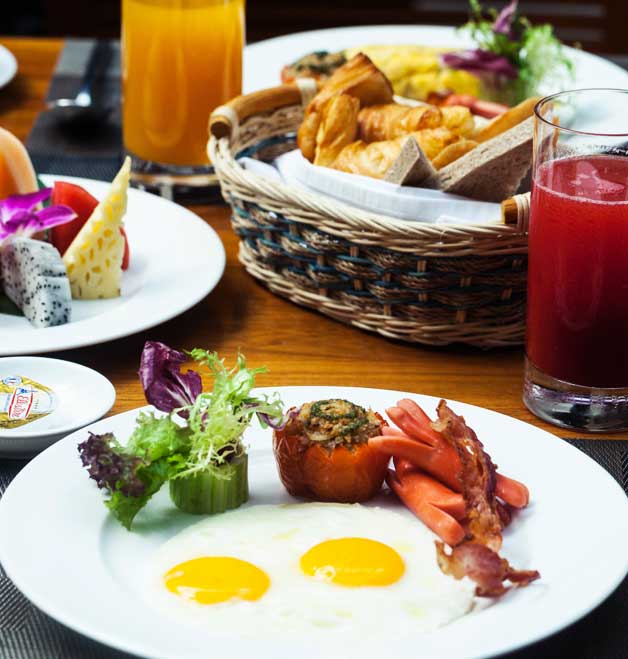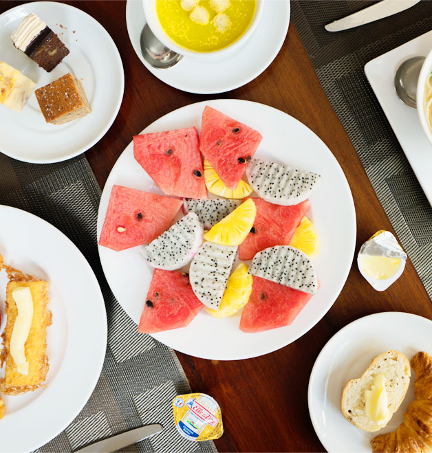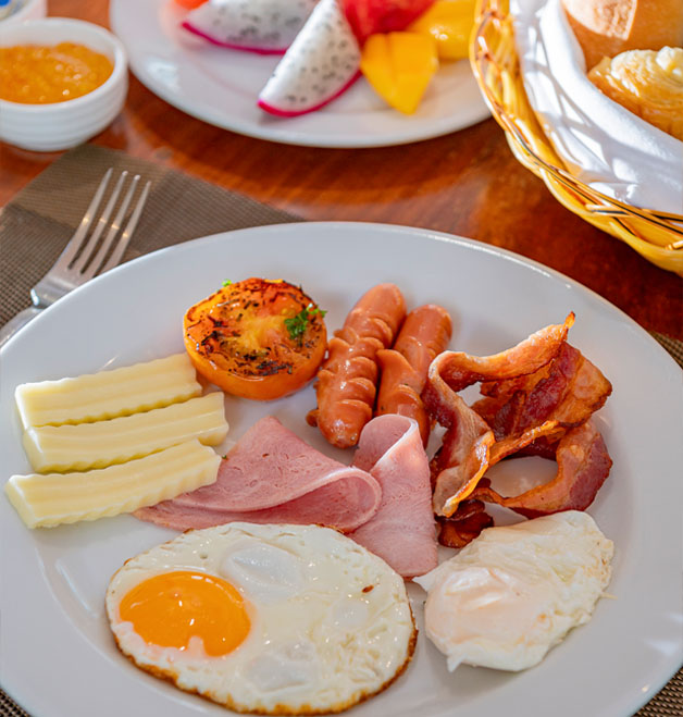 Breakfast is served as a buffet with a big selection of hot meals that change daily, a salad bar, 3 fruit options and an egg and noodle soup stations. Select your breakfast from the buffet styled options or if you like something not available, order it and the chef will make it specially for you.